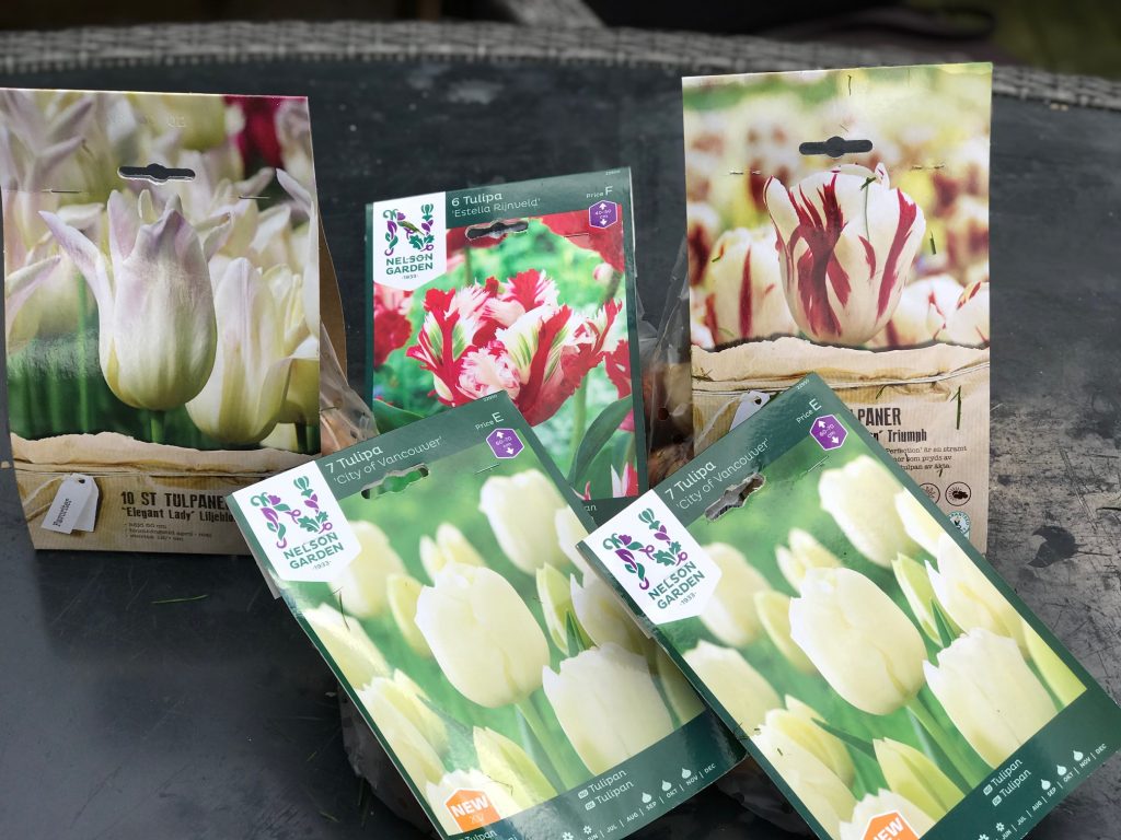 I helgen var jag på Blomsterlandet i Hässleholm och handlade tulpanlökar eftersom de hade 25 procent rabatt. Dem grävde jag ner i rabatten runt syrenträdet på framsidan, Triumphtulpan ”Grand Perfection” som är en tulpan med vita blommor och som pryds av eldröda flammor på utsidan och en vit tulpansort som heter ”City of Vancouver”. De ska bli cirka 50 respektive 70 cm höga. Sedan grävde jag ner lite nya tulpanlökar i rabatten vid farstun. Där fick det bli en papegojtulpan som heter ”Estella Rijnveld”. Den är jätteläcker med hallonröda och vita flammor och ska bli cirka 40-50 cm hög. Sist men inte sämst eller vad man nu skriver så grävde jag ner en hel del ”Elegant Lady” som är en vit tulpan med skir rosa bladverk som också är jättefin. Den ska också bli cirka 50 centimeter hög och alla ska blomma i april, maj och juni. Nu hoppas jag bara att dovhjortarna och hararna låter lökarna vara ifred i vinter.